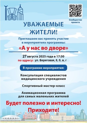 27.08.2025 в 17.30 во дворе по адресу: ул. Береговая, 8, б, в, г пройдет мероприятие в рамках проекта "А у нас во дворе"