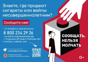 Плакаты и постеры социальной рекламы проинформируют жителей региона о работе специальной «горячей линии» по приему обращений граждан о случаях продажи вейпов и сигарет подросткам. Сообщить о таких фактах можно также на сайте «спасибозаотказ.рф» и в Телеграм-боте «Родительский патруль».