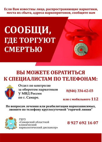 Информацию о преступлениях и правонарушениях в сфере незаконного оборота наркотиков можно сообщить по круглосуточным телефонам дежурной части ГУ МВД России по Самарской области 8 (846) 921-22-22, 8 (846) 921-22-23, в дежурные части территориальных органов внутренних дел или по многоканальному телефону 102, а также на официальный интернет-сайт https://63.мвд.рф